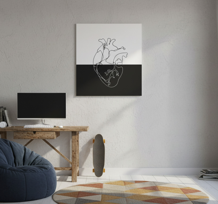 この現代アート作品は、黒と白の背景に分かれたミニマリストのハートのイラストを特徴としています。クリーンなラインはハートの複雑な構造を強調し、魅力的な焦点を生み出しています。周囲の空間には、コンピューターとスケートボードがある居心地の良い部屋が描かれており、現代的な美学を引き立てています。 ポスター ユースルーム 幾何学的ハートラインアート