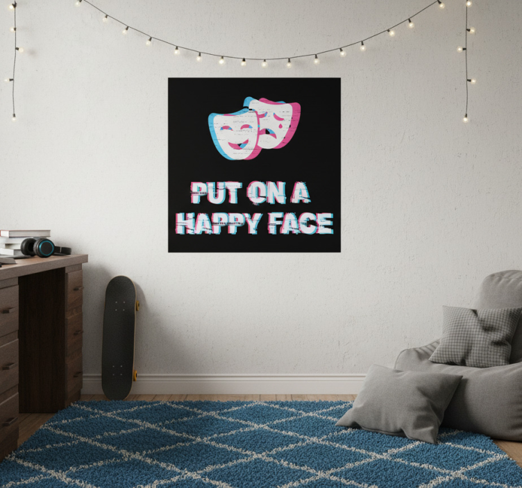 この印象的な画像は、感情を表現する鮮やかな演劇のマスクが並んでいます。背景は真っ黒なキャンバスで、強いコントラストを生み出しています。目立つテキストには 'PUT ON A HAPPY FACE' と記されており、グリッチ効果が視覚的なインパクトを高めており、芸術的またはモチベーショナルなテーマに最適です。 ポスター ユースルーム ハッピーフェイスエクスプレッションは、明るく楽しいデザインで、見る人の心を癒すことができるアイテムです。このポスターは、幸福感を与えるハッピーフェイスの表情を描いており、ユースルームにぴったりの装飾になります。子供部屋やリビングルームに飾ることで、ポジティブな雰囲気を演出し、訪れる人々に笑顔をもたらします。