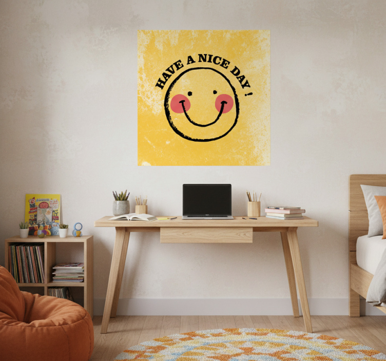 鮮やかで陽気なアートワークは、テクスチャーのある黄色い背景に微笑む顔を描いています。'HAVE A NICE DAY!'というフレーズが幸せな顔の上にアーチを描いており、 upliftingな雰囲気を作り出しています。このデザインは、オフィスや個人のスペースを明るくするのに最適で、どんな環境にもポジティブさと喜びを招き入れます。