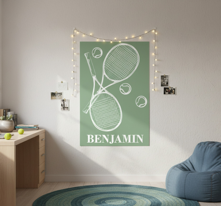 この画像は、淡い緑の背景に交差した2本のテニスラケットを特徴とするスタイリッシュなデザインを示しています。ラケットの横にはテーマを引き立てる2つのテニスボールがあります。イラストの下には、太字のフォントで「BENJAMIN」という名前が目立つように表示されており、全体的な美しさに個人的なタッチを加えています。 ポスター ユースルーム パーソナライズテニス
