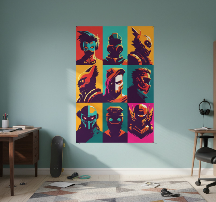 この活気に満ちたアートワークは、スタイライズされたキャラクターのグリッドを特徴としており、それぞれが鮮やかな色彩と大胆なコントラストで描かれています。ユニークなポートレートは、多様なデザインを披露し、未来主義とファンタジーの要素を組み合わせています。ゲーム愛好者に最適なこの印象的な壁画は、どんな居住空間にもエネルギッシュなタッチを加え、創造性と現代的な美学を強調します。
