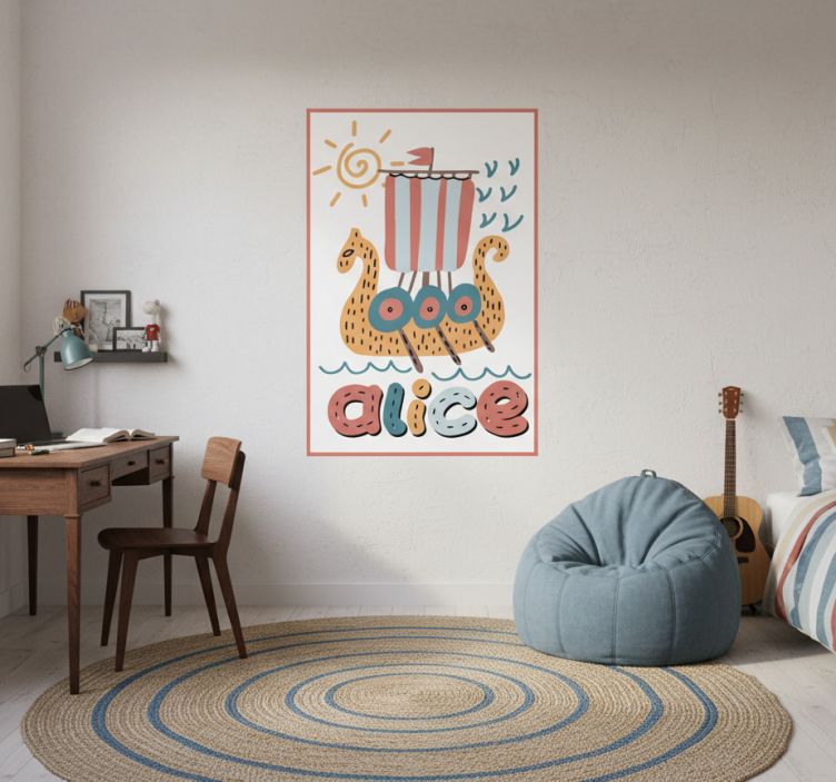 イラストには、カラフルなオールと帆で飾られたバイキングのロングボートに似た whimsical な船が描かれています。その下には、「Alice」という名前が遊び心のある文字で表示されています。明るい太陽が上に輝き、スタイライズされた波や鳥が添えられ、軽快で想像力豊かなシーンを作り出しています。 ポスター ユースルーム ヴァイキング船の名入れ
