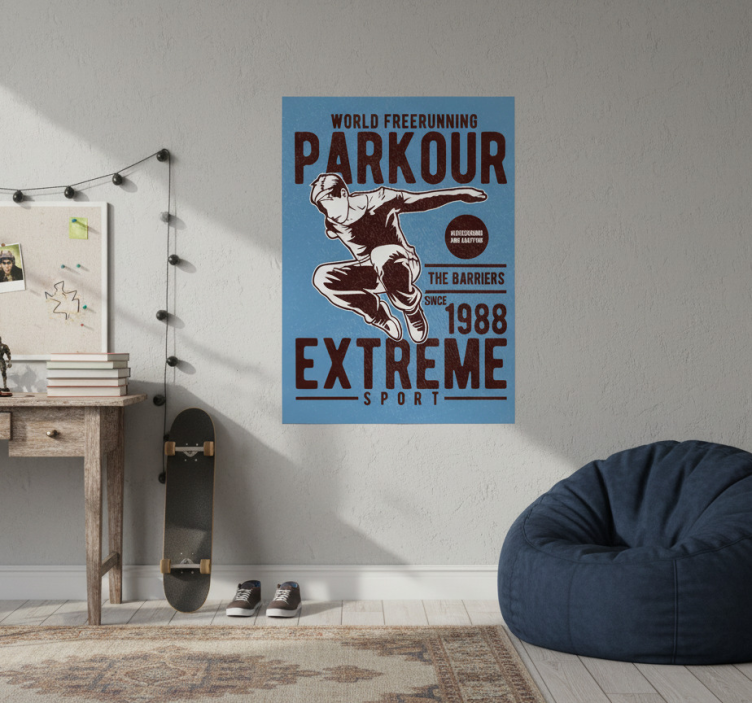 この画像は、パルクールをエクストリームスポーツとして宣伝する鮮やかなポスターを示しています。ダイナミックなフリースタイラーがジャンプ中で、敏捷性と障害を克服することを強調しています。テキストは1988年からのスポーツの基盤と、障壁を克服するという哲学を強調しています。背景は大胆に対比され、視聴者とのエンゲージメントを高めています。
