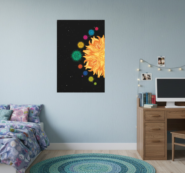 この鮮やかなアートワークは、複雑な模様を持つ印象的な太陽が描かれ、深い黒の背景に対して温かさを放っています。周囲には鮮やかな色彩の天体が浮かんでおり、宇宙のテーマをさらに引き立てています。創造性と想像力を呼び起こすのに最適なこの作品は、どんな空間にも驚きの感覚をもたらします。