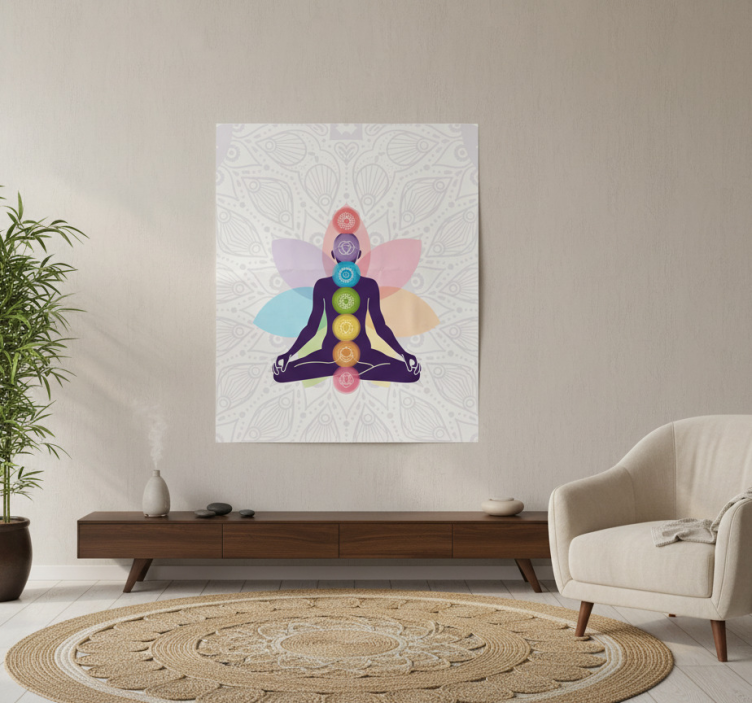 穏やかな室内の設定には、活気に満ちたチャクラのシンボルに囲まれた瞑想的な人物が描かれています。カラフルなデザインは微妙な背景に対して対照的で、静けさを高めています。家具や装飾からのアーストーンが精神的なテーマを引き立て、リラックスとマインドフルネスをこの空間に招き入れています。このアートワークは、ウェルビーイングと調和を促進します。