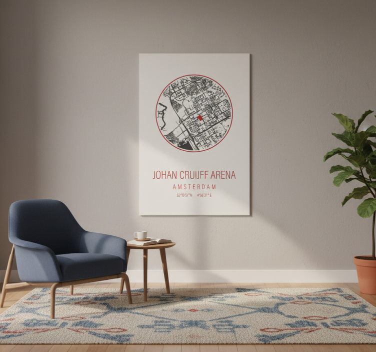 この画像は、アムステルダムのJohan Cruijff Arenaを特徴としたスタイリッシュなウォールアートを展示しています。円形の地図デザインは、鮮やかな赤いマーカーでその場所を強調しています。下には、会場の名前と座標が現代的なフォントで優雅に表示されており、現代的な装飾と調和しています。 スポーツ ポスター アムステルダムアリーナ