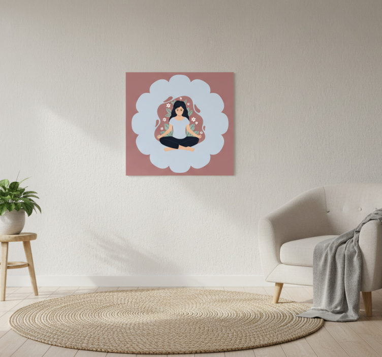穏やかな環境で瞑想している女性の静かなイラスト。柔らかなパステルカラーに囲まれ、彼女は安らぎを漂わせています。生い茂る葉や繊細な花々が穏やかなシーンを引き立て、マインドフルネスへの焦点を高めています。このアートワークはリラクゼーションと内なる平和を体現しており、ウェルネスやストレス解消を促進するのに最適です。