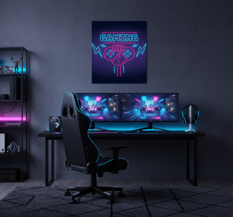 このダイナミックな画像は、鮮やかで未来的なグラフィックスを表示するデュアルモニターを備えた現代的なゲーミングセットアップを紹介しています。快適なゲーミングチェアがデスクの前に置かれ、周囲の照明が全体の雰囲気を引き立てています。壁には「GAMING」というタイトルの印象的なネオンアートが飾られ、ゲーミング文化を祝っています。 ビデオゲームのポスター ネオンライトのゲーミングロゴ