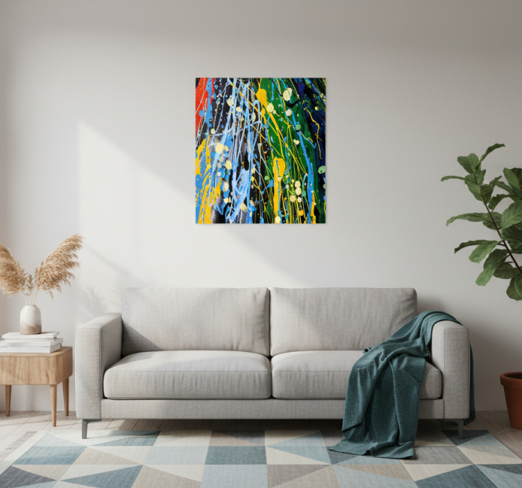 壁に目立つように展示された鮮やかなアートワークは、青、黄色、緑、赤のダイナミックな色のブレンドを特徴としており、エネルギッシュな視覚的インパクトを生み出しています。その下には、現代的な美学を引き立てるグレーのソファがあり、心地よいブランケットが質感を加えています。自然光が空間全体の雰囲気を高めています。