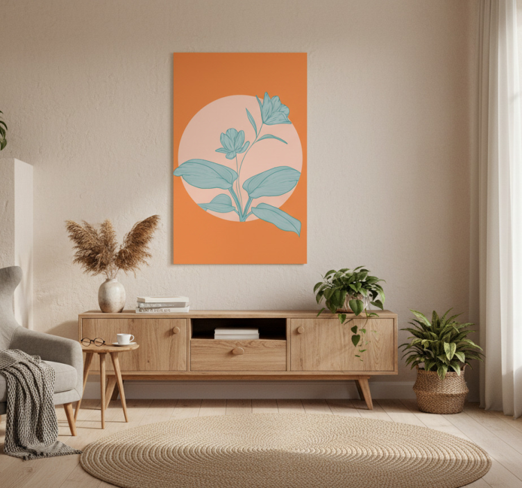 ポスター リビングルーム オレンジの形に青い花