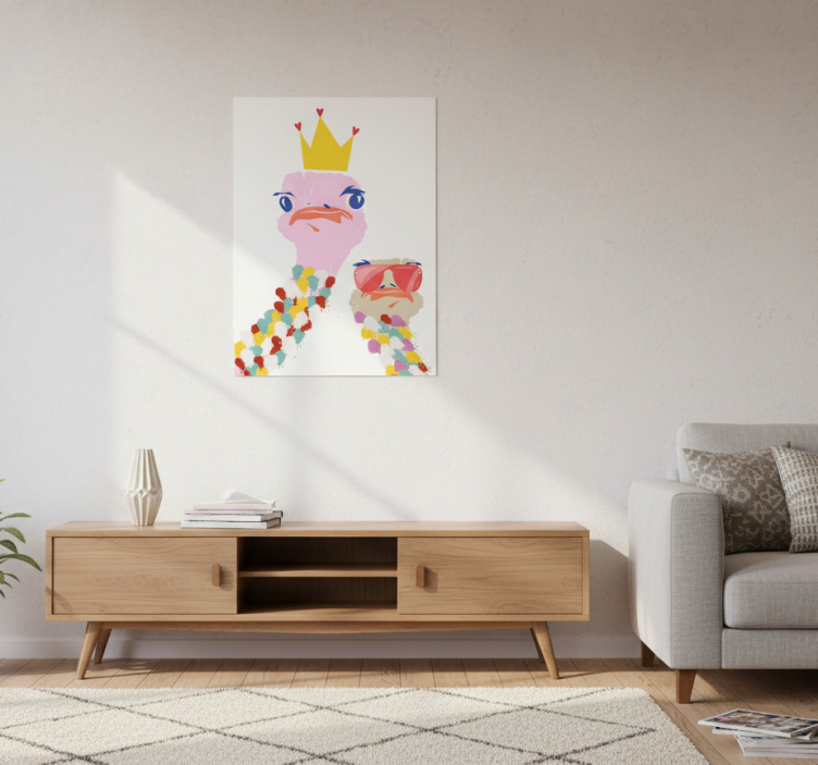 この鮮やかなアートワークには、カラフルな羽と遊び心あふれるアクセサリーを身に着けた二羽のユニークなダチョウが描かれています。ピンクのダチョウは王冠をかぶり、気品を漂わせている一方、もう一羽はおしゃれなサングラスをかけています。二羽は一緒に、部屋の装飾に独特の魅力を加え、明るく楽しい印象を与えています。