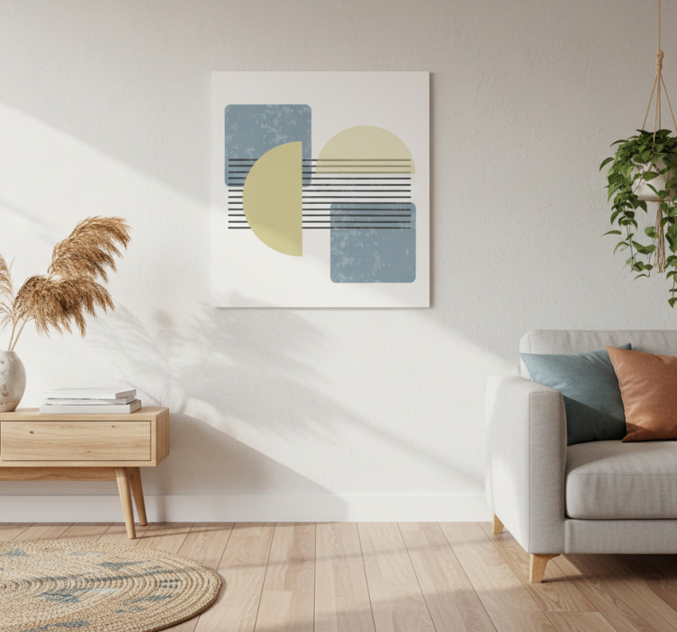 この現代アート作品は、柔らかな黄色や muted blue を含む心地よい色合いの幾何学的な形状を特徴としています。長方形と円が調和して繋がり、遊び心のあるバランスの取れた構成を生み出しています。繊細な線が奥行きを加え、現代的な美学を高めています。アートのタッチでリビングスペースを明るくするのに最適です。 ポスター リビングルーム 現代アート モダンデザイン