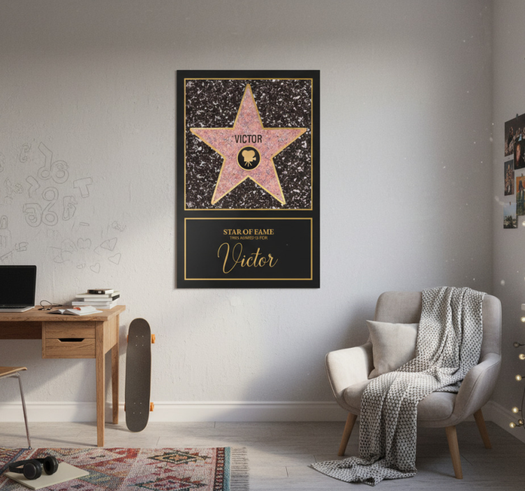 画像は、ピンクの星が目立つように「VICTOR」とラベル付けされたスタイリッシュな壁掛けプレートを示しています。この装飾アイテムは、斑点のある黒い背景に囲まれた認識を象徴しています。星の下には、エレガントな金色の銘文が「STAR OF FAME」と記されており、達成や節目を祝うための完璧なギフトとなっています。 ポスター リビングルーム カスタム名声の星