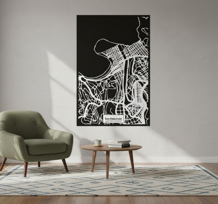 この印象的な壁アートは、サン・セバスティアンの詳細なモノクロマップを特徴としています。複雑な線画が深い黒の背景に映え、現代的な美学を生み出しています。現代的なインテリアに最適で、この作品は都市地理を芸術的な形式で祝うユニークなタッチを追加します。