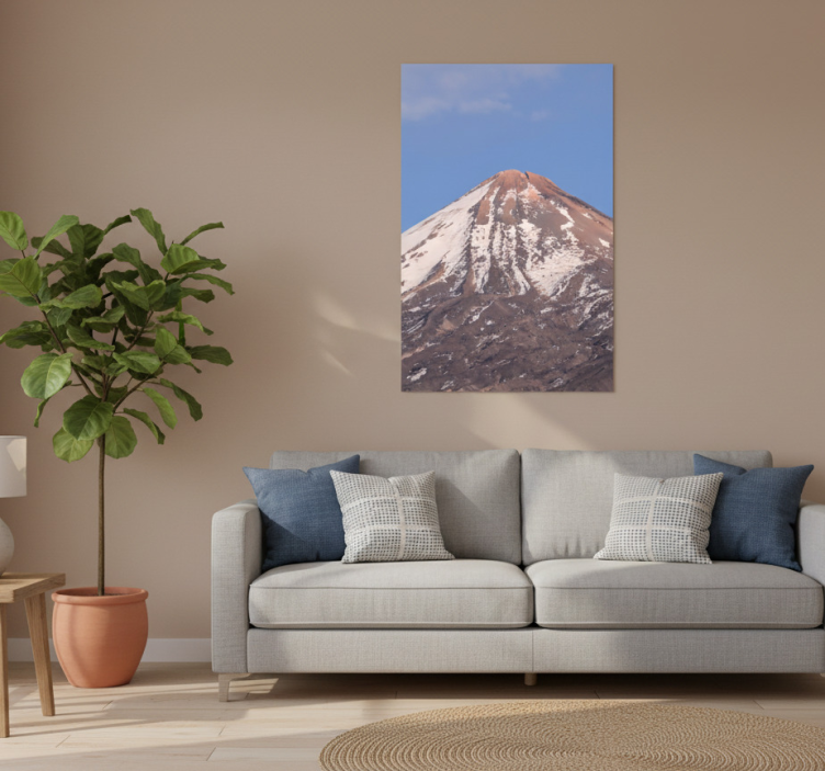 雄大な山の頂が澄んだ青空にそびえ立ち、雪と岩の表面が融合しています。その下には、装飾的なクッションが施されたモダンなソファがある居心地の良いリビングルームがあり、葉の多い植物と木製のテーブルが添えられています。この穏やかな環境は、自然と現代的な装飾が調和しています。 ポスター リビングルーム テイデ山