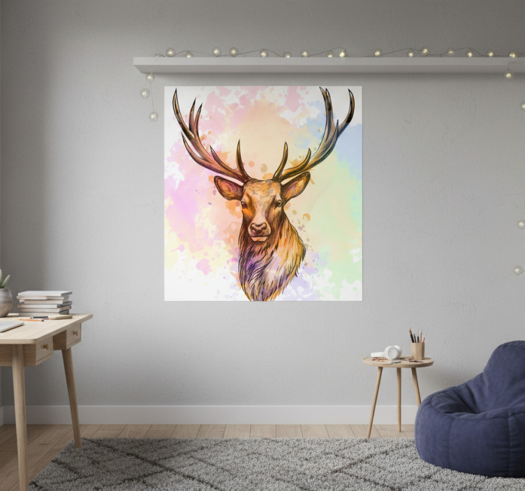 壮麗な鹿の頭のイラストは、目を引くようにそびえ立つ壮大な角を特徴としています。背景にはカラフルな水彩効果が表現され、柔らかなパステルカラーが溶け合い、幻想的な雰囲気を醸し出しています。このアートワークはリアリズムと芸術的なひねりを組み合わせており、現代的な装飾や自然をテーマにした空間の魅力的なセンターピースとなっています。