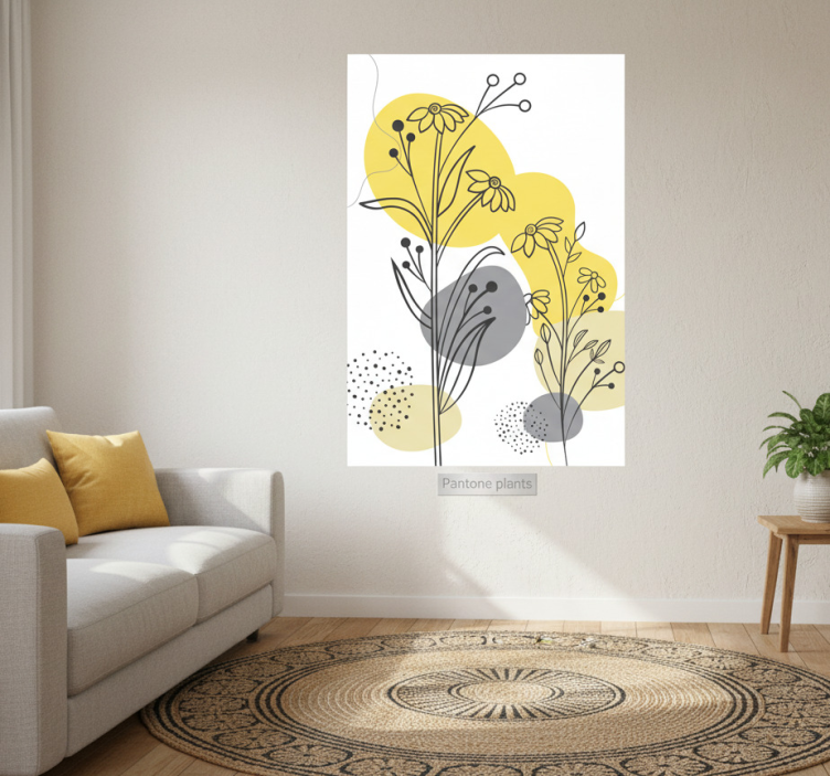 このアートワークは、繊細なラインアートと鮮やかな黄色のアクセントを持つミニマリストな花のデザインを特徴としています。構図は、グレーと黄色のトーンで抽象的な形と組み合わされたエレガントな花々を展示しています。現代的なスタイルが加わり、自然にインスパイアされた優雅さであらゆるインテリア空間を引き立てるのに最適です。 ポスター リビングルーム パントンの植物