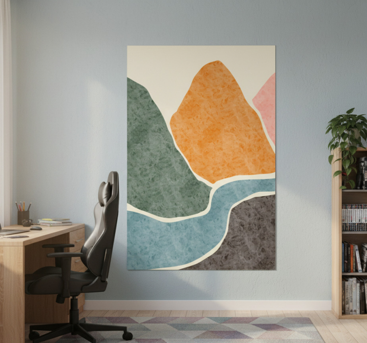 このアート作品は、オレンジ、緑、ピンクなどの柔らかく muted な色合いで作られた抽象的な山の形を特徴としています。穏やかで曲がりくねった川が風景を流れ、白でアウトラインされています。背景は明るい色合いで、穏やかな雰囲気を引き立て、モダンなデコールの設定に適しています。 ポスター リビングルーム 現代抽象画