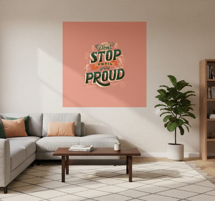 この魅力的な画像には、活気あるタイポグラフィで表現されたインスピレーショナルな引用が含まれています。フレーズ 'Don't Stop Until You're Proud' は、温かみのあるピンクの背景に際立って表示されています。芸術的な装飾がデザインを引き立て、ふかふかのソファと装飾的な植物で飾られた居心地の良いリビングスペースが全体の美的感覚を補完しています。 ポスター リビングルーム 誇り高い言葉