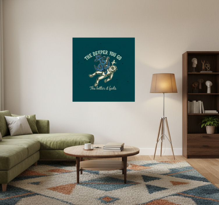 この鮮やかなイラストは、宇宙飛行士とアンカーを描いており、冒険心を伝えています。デザインはダークティールの背景に設定されており、アートワークが際立っています。テキストには、'The deeper you go, the better it feels'と書かれており、探検と楽しさを強調しています。海洋や冒険をテーマにしたスペースの装飾に最適です。 ポスター リビングルーム 深くなるほど響く言葉