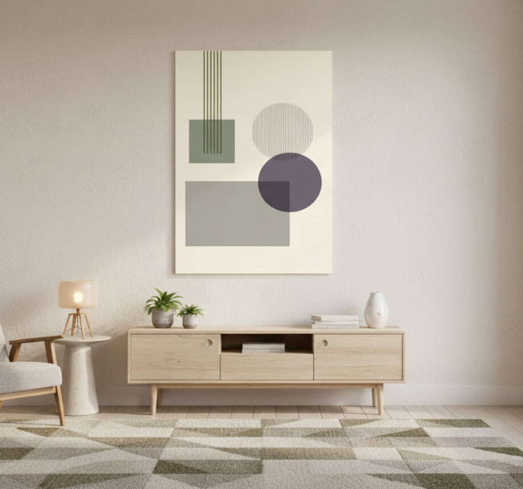 この画像は、ミニマリスティックな装飾が施されたスタイリッシュなインテリアを描写しています。幾何学的な形状の大きなアートワークが壁に掛かっており、 muted colors のグリーンやパープルを使用しています。スリークな木製のコンソールテーブルが装飾品を支え、居心地の良いアームチェアとパターン入りのラグがモダンなエレガンスを醸し出しています。 ポスター リビングルーム ソフトな幾何学的形状