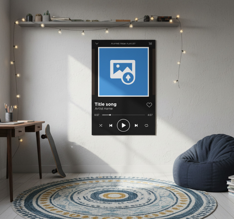 この画像は、スタイリッシュな壁掛け音楽プレーヤーを備えたモダンなインテリアを示しています。鮮やかなアートワークには、風景画像のアップロードアイコンが描かれています。居心地の良い要素として、ふわふわのビーンバッグチェアと装飾的な円形ラグがあります。柔らかな照明が雰囲気を高め、リラックスと楽しみに最適な心地よい空間を作り出しています。