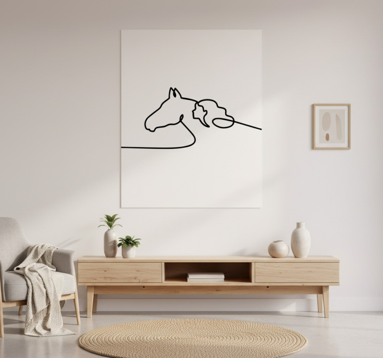 この画像は、馬ともう一つの動物のミニマリスティックなライン描画を特徴としており、調和の取れた美しさを生み出しています。中立的な壁を背景に、アートワークは現代的なインテリア空間を引き立てています。自然な装飾要素と組み合わさることで、この構成はエレガントな部屋における静けさと洗練を反映しています。 ポスター リビングルーム 馬と女性のラインアートイラスト