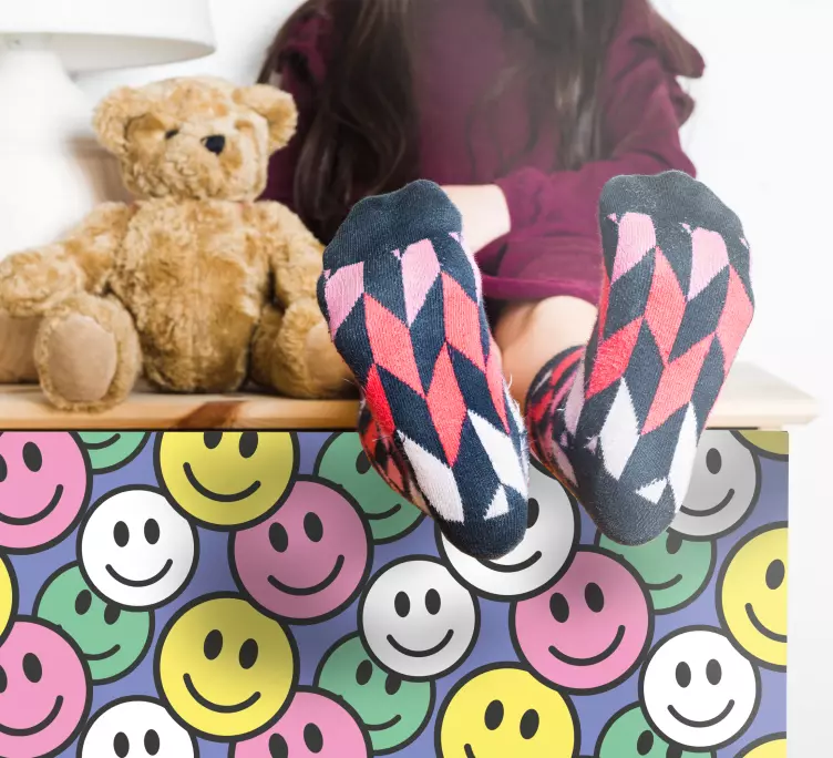 参考: A49043明るい色合いが遊び心を引き立て、子供に優しい環境にぴったりなデザインを作り出しています。笑顔の顔が生き生きとしたパターンで配置され、喜びとポジティブな雰囲気を醸し出しています。