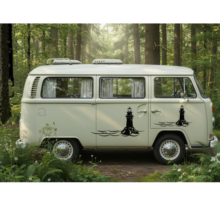 静かな森の中に駐車されたヴィンテージバンは、灯台のデザインを通じて海岸のテーマを表現し、導きと安全を象徴しています。自然の周囲は、ロードトリップの冒険的な雰囲気を高めます。それは見物客を旅に誘い、探検と家庭の感覚の両方を受け入れることを促します。