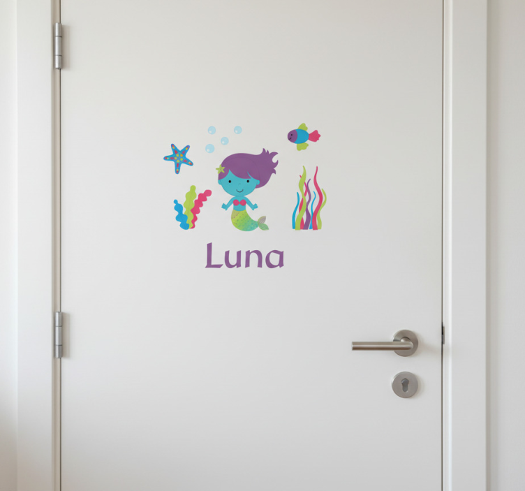 陽気な人魚とカラフルな海の生き物たち、魚やヒトデが一緒に描かれた、 whimsical な水中のシーン。デザインは遊び心を加え、子供部屋にぴったりです。表示される名前は個性を表し、個人的なつながりと所有感を招きます。