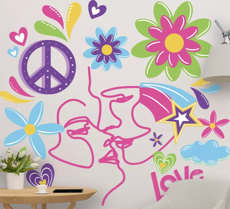 参考: A48089絡み合った顔、カラフルな花、そして「heart shapes」を象徴する愛と平和をテーマにした活気ある構成。この生き生きとしたアレンジメントは遊び心にあふれ、個人の空間に魅力的なアクセントを加え、温かく迎え入れる雰囲気を促進します。