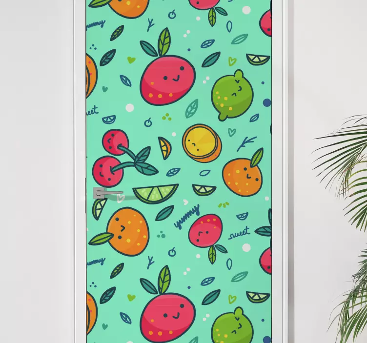 参考: A48103オレンジ、チェリー、ライムを含む陽気なフルーツイラストの活気あるコレクション。遊び心あふれるデザインは喜びと新鮮さを伝え、どんな空間にも whimsical なタッチを加えるのに最適です。生き生きとした色合いと幸せな表情が、心地よい雰囲気を作り出します。