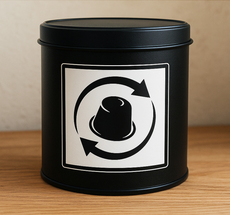 円筒形の容器は、中央の形状を取り囲む矢印によって回転を強調するデザインを特徴としています。このビジュアルは、リサイクルや再利用に焦点を当てており、持続可能な実践への意識を促進します。全体的な印象はミニマリストで、自然な木のテクスチャを背景にメッセージが際立つようになっています。