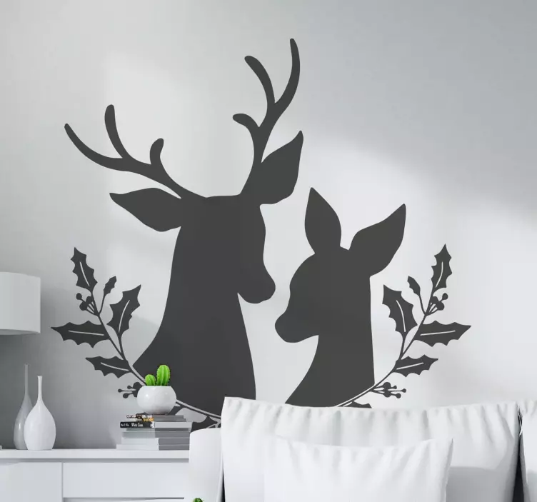 魅力的な二頭の鹿の描写で、複雑な角と穏やかな表情が特徴です。ホリーの枝に囲まれています。このデザインは温かさと自然とのつながりを感じさせ、どんな空間も穏やかで招待するような環境に変えるのに最適です。