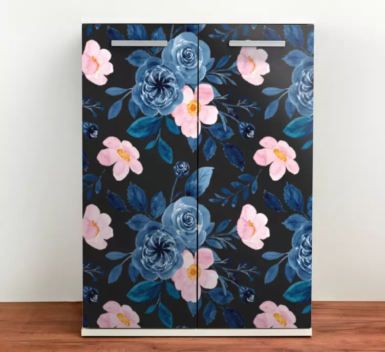 参考: A51591ダークな背景に青とピンクの花々が融合した魅力的な花柄。このデザインは鮮やかでリフレッシュな雰囲気をもたらし、飾られた空間の雰囲気を高めます。自然の美しさを加えるのに最適です。