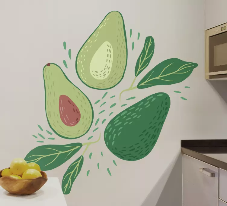 この鮮やかな描写は、アボカドの配置を特徴としており、その豊かな緑色と独特の形状を見せています。付属の葉は自然な感覚を高め、健康的な食事や新鮮な食材とのつながりを反映しています。