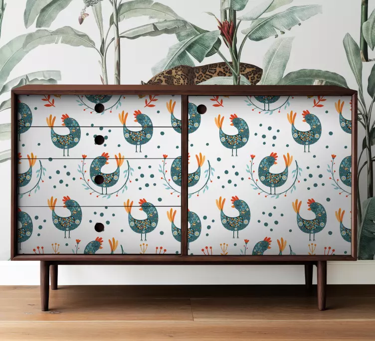 動物シール 活き活きとしたニワトリのイラストは、カラフルで遊び心満載のデザインが特徴です。鶏や他の農場の動物が描かれたこのシールは、花やパターンを組み合わせることで、どんな家具にも楽しい雰囲気を加えます。グラフィックデザインは、視覚的にインパクトがあり、見る人を惹きつける魅力があります。