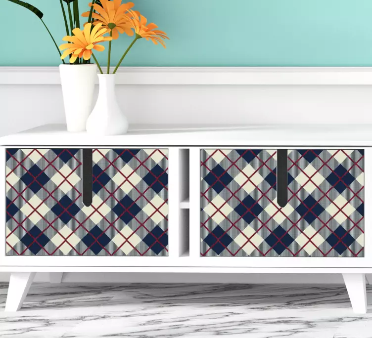 参考: A49298この製品は、ネイビー、クリーム、レッドのトーンを組み合わせた洗練されたチェック柄を特徴としており、印象的な幾何学的配置が施されています。そのデザインはエレガンスとスタイリッシュなシンプルさを融合させており、ホームデコのさまざまな表面を引き立てるのに最適です。