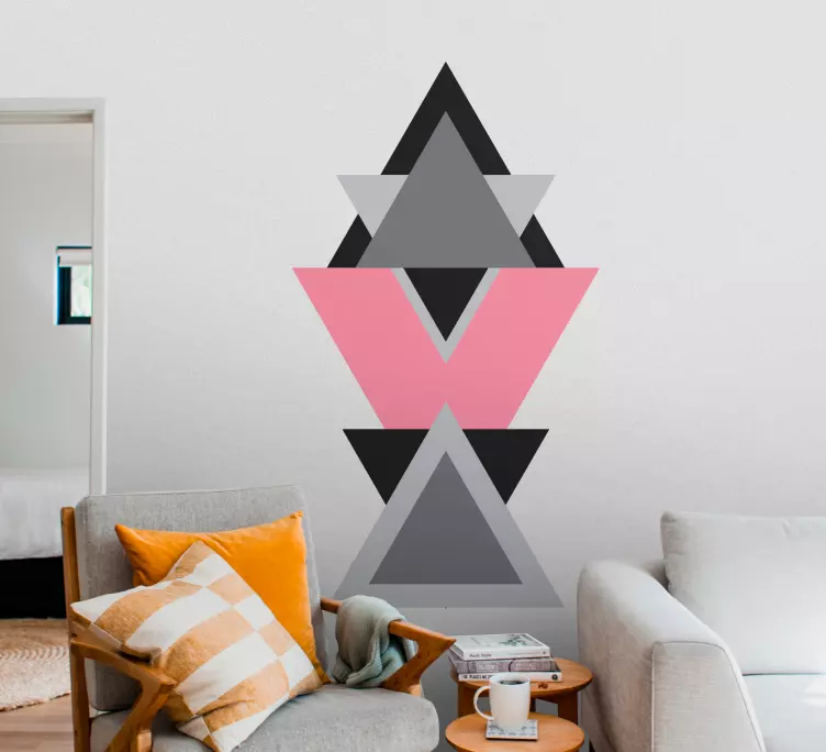 参考: A48905このアートワークは、ピンク、グレー、黒のさまざまな色合いの重なり合った三角形の配置を特徴としています。このデザインは視覚的に印象的な効果を生み出し、大胆な幾何学的形状で現代的な空間を引き立てます。色の相互作用が構成に深みと興味を加えています。
