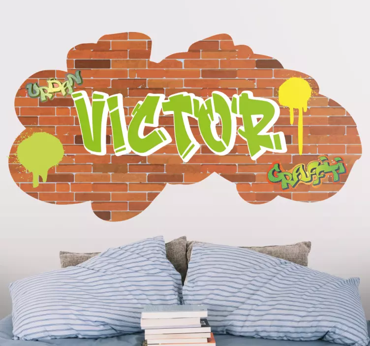 参考: A49593レンガの背景に太いグラフィティスタイルで名前が描かれた、鮮やかでカスタマイズ可能な作品。色のスプラッシュで飾られ、どんな空間にも個人的なタッチを加えるのに最適です。このデザインは都市的な美学を高めつつ、個々の表現を可能にします。