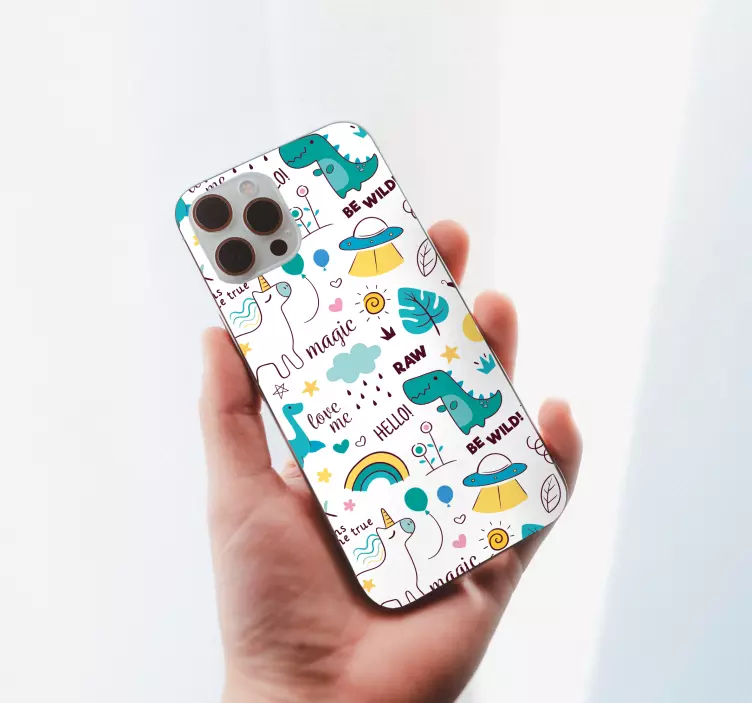 参考: A49420この遊び心あふれるデザインは、恐竜やユニコーンなどの様々な幻想的な生き物が、虹や雲、楽しいフレーズなどの要素に囲まれています。鮮やかな色合いと魅力的なイラストが、ユニークで想像力豊かなテーマを好む人にぴったりの明るい雰囲気を作り出しています。