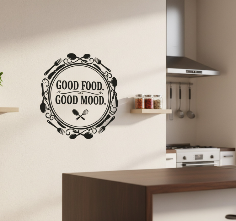 装飾的なキッチンの壁デザインは、キッチン用具で飾られた円形の枠を特徴としています。目を引くフレーズ「GOOD FOOD. GOOD MOOD.」は、楽しい食事とポジティブな雰囲気とのつながりを強調し、明るい料理スペースをインスパイアします。これは、キッチンの装飾を高めたい食べ物愛好家や家庭のシェフにとって理想的なアクセントです。