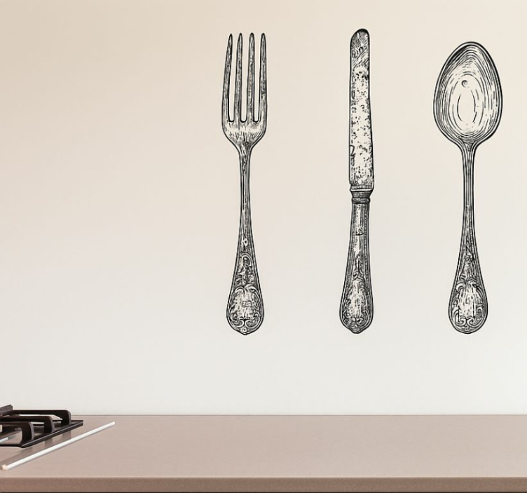 ヴィンテージ風のアレンジメントは、フォーク、ナイフ、スプーンが直線的に配置されています。器具の繊細なディテールがエレガンスを加え、ダイニングエリアを引き立てます。このデザインは、食事の楽しさがしばしば共有された食事による絆にあることをさりげなく強調しています。