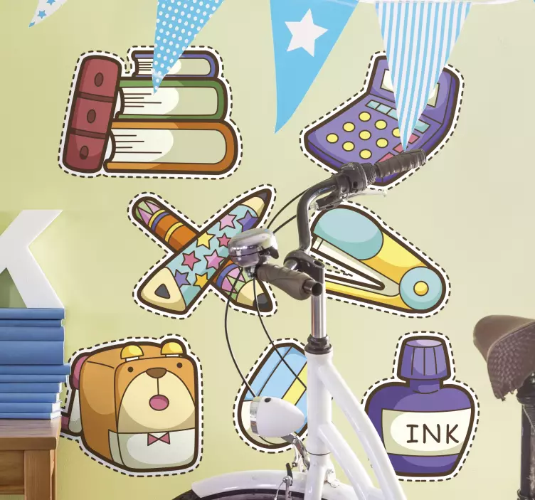 本、クレヨン、計算機をフィーチャーした活気あふれる文房具のコレクション。この遊び心満載のアソートメントは、創造性と学びの本質を捉えており、子供のスペースにぴったりです。このデザインは想像力を刺激し、学びや遊びに特化したエリアに楽しい要素を加えます。