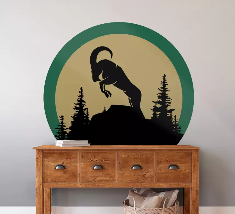 参考: A48507大きな木々に囲まれた柔らかな色合いの円形背景の中で、飛び跳ねる山羊の印象的なシルエットが捉えられています。このデザインは冒険心と野生動物の本質を呼び起こし、自然や大自然に触発された人々にぴったりです。