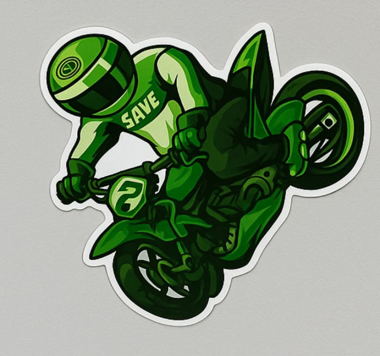 ダイナミックなイラストは、ライダーがバイクでスリリングなスタントを決めている様子を捉えています。このデザインは冒険と興奮の感覚を伝えています。「SAVE」という言葉がライダーの衣装を引き立て、アドレナリンが満ちた雰囲気の中で保存や注意のメッセージを示唆しています。これはモータースポーツにおけるスリルを求める精神を反映しています。 動物 シール グリーンライダー スプレー