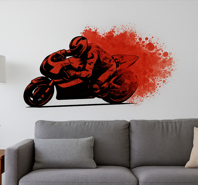 ダイナミックなデザインは、鋭いカーブに身を寄せるバイクレーサーを描いており、スピードとアドレナリンを伝えています。背景の大胆なスプラッシュはエネルギッシュな雰囲気を加え、動きを強調しています。このビジュアルはモーターサイクルレースのスリルを捉え、愛好者に訴えかけ、どんな空間にも鮮やかなタッチを加えます。