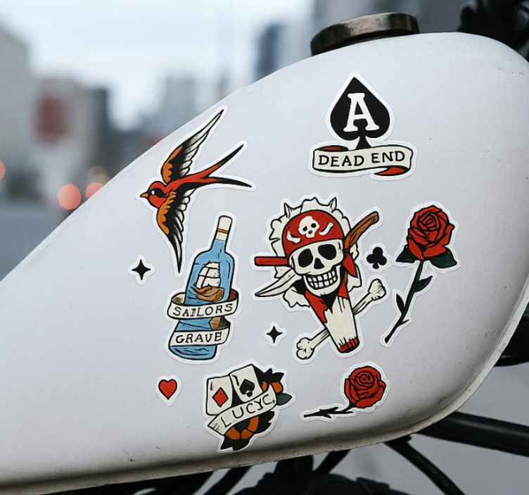この製品には、海洋とドクロをテーマにした活気あるデザインが施されています。ドクロと交差する骨、バラ、そして「SAILORS GRAVE」とラベルが付けられたボトルなどの要素が含まれ、反抗的な精神を体現しています。「DEAD END」というフレーズは、冒険や人生で押し広げるかもしれない境界についての反映を示唆しています。 動物 シール タトゥー燃料タンクは、可愛らしい動物のデザインが施された独特な製品です。色鮮やかで魅力的なこのタトゥーは、あなたの燃料タンクを個性的に演出します。動物たちが元気に描かれ、見る人を楽しませるデザインは、どんなシーンにもぴったりです。このシールは、サテン仕上げで製造されており、光の下でも反射せず、優れた色の強度を提供します。