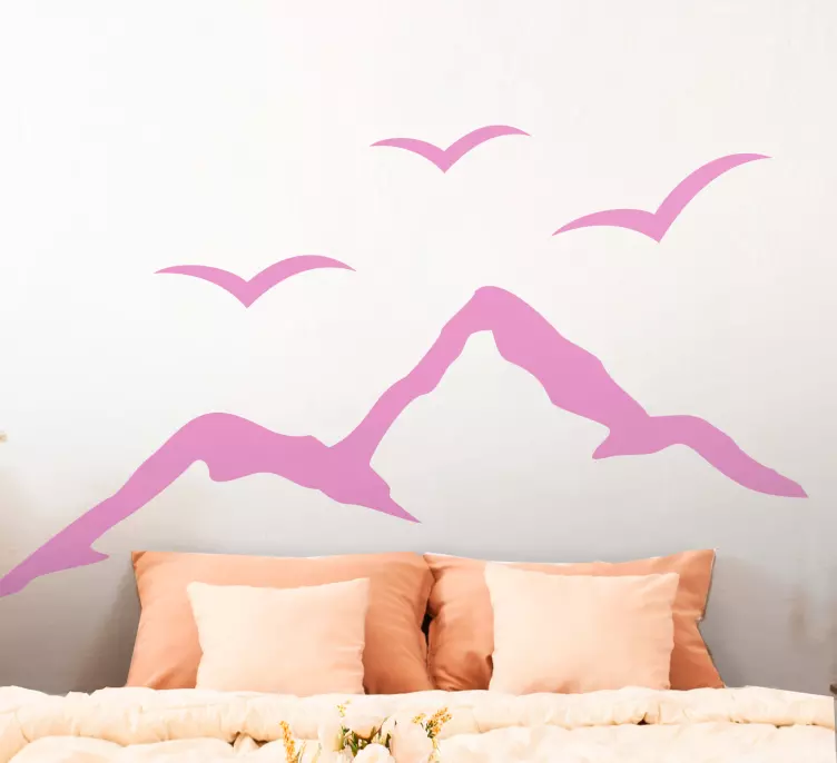 参考: A48502スタイリッシュな山のシルエットと飛んでいる鳥が組み合わさり、穏やかな雰囲気を生み出します。このデザインは自然の美しさを強調し、居住空間における静けさを促進するのに最適です。ミニマリストスタイルは、さまざまなインテリアテーマに調和します。