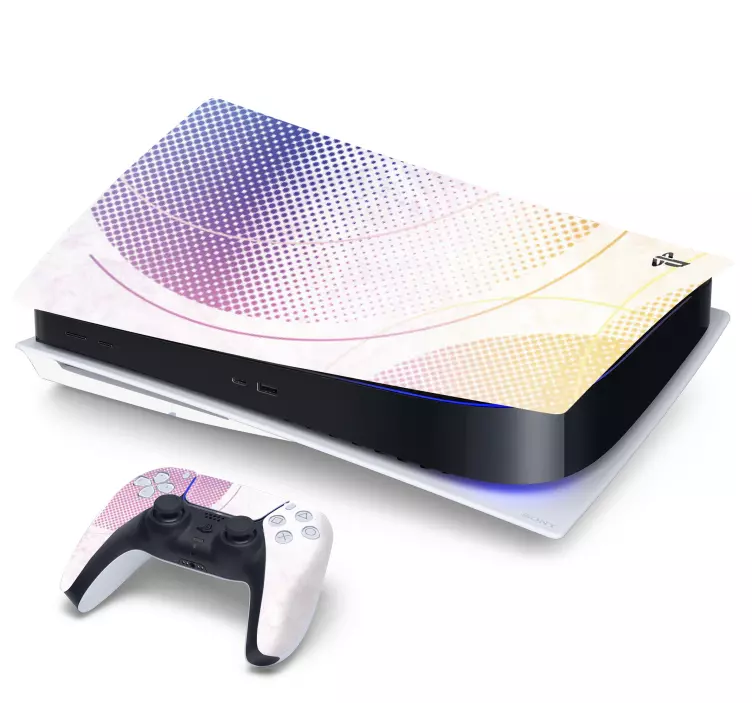 ピンク、紫、黄色の色合いの幾何学模様が特徴の鮮やかなデザインで、ゲームコンソールとコントローラーを引き立てています。要素は見事に融合し、ゲーム愛好者向けのスタイリッシュでユニークな外観を提供します。